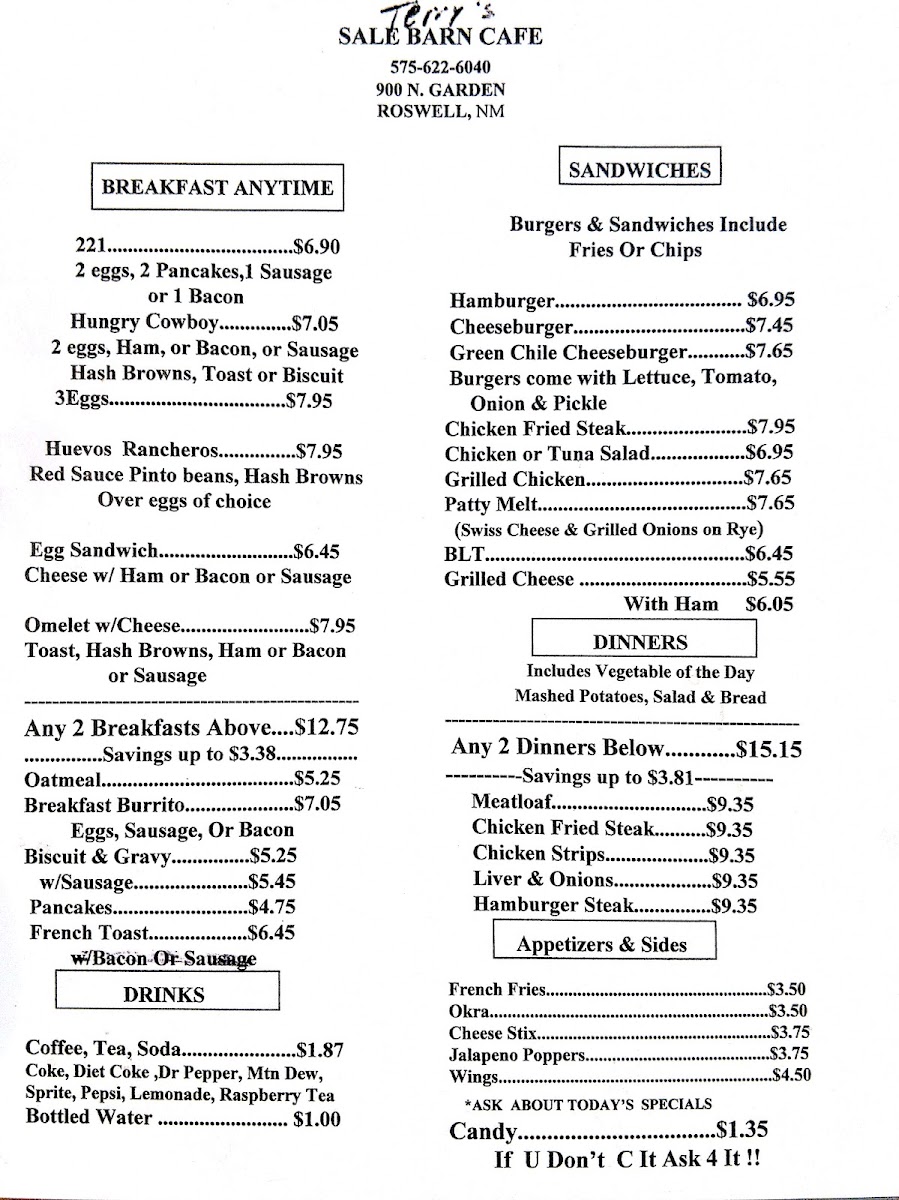 Welcome to Sale Barn Cafe, a hidden gem located at 900 N Garden Ave, Roswell, NM, known for its welcoming atmosphere and delicious food. As you step in, you’ll experience the warmth of a hometown cafe, where owners Terry and Candy treat every guest like family.
